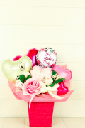 母の日専用のバルーンアレンジです。いつものお花束でなくバルーンで出来ているバルーン花束タイプのアレンジ。「今年は、ちょっと違うね」とお母さんも、周りの友達に自慢することになるでしょうね。