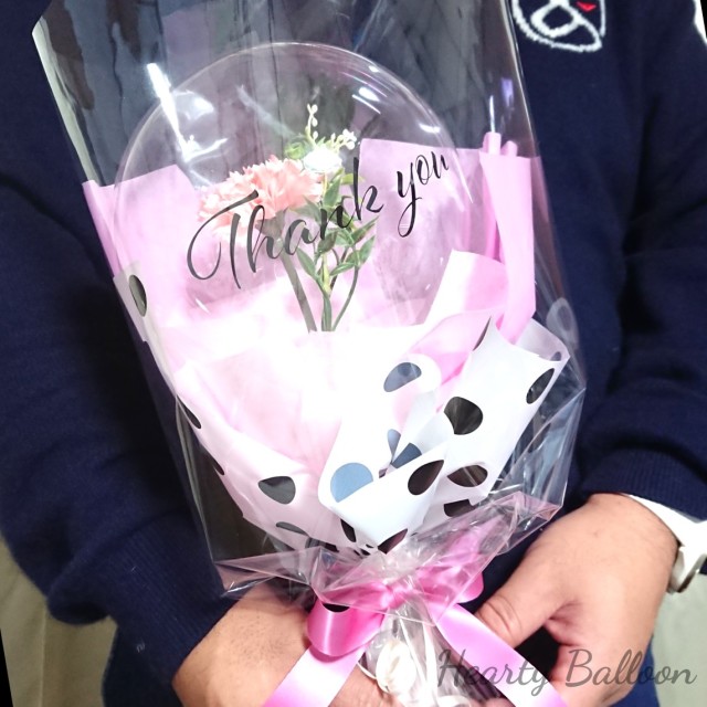 母の日専用のバルーンギフトです。 透明なバルーンにカーネーションが入ってしる今年流行りのバルーンギフトです。 サイズは高さ45cm幅20cmくらいの丁度いいサイズ感でデザインしました。 いつものお花束でなくバルーンで出来ているバルーン花束タイプのアレンジ。「今年は、ちょっと違うね」とお母さんも、周りの友達に自慢することになるでしょうね。