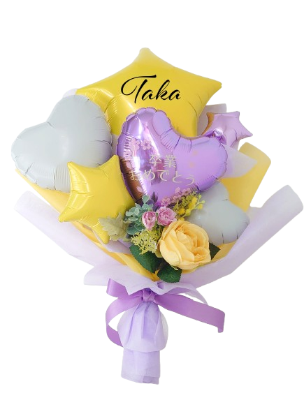 オリジナルプリント出来るバルーンギフトです。 数量限定です。お早めにご注文下さいね。 サイズは高さ50cm幅30cmくらいの大き目なサイズ感でデザインしました。 あげるのにも、もらうのにも嬉しいサイズ感です。 OPPフイルムでラッピングしてお届けします。
